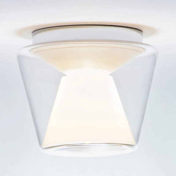 Annex LED Deckenlampe hat einen Lampenschirm aus geblasenem Glas und einen Innenreflektor aus Aluminium. Die Lampe ist eine einfache geometrische Konstruktion, die aus konischen Formen besteht, die miteinander interagieren. Der Reflektor erzeugt eine doppelte Beleuchtung, die sowohl die Decke als auch den darunter liegenden Raum erhellt. Dieses Modell verfügt über ein fokussiertes Downlight, das dank des klaren Reflektors oben und unten die gleiche Helligkeit aufweist.