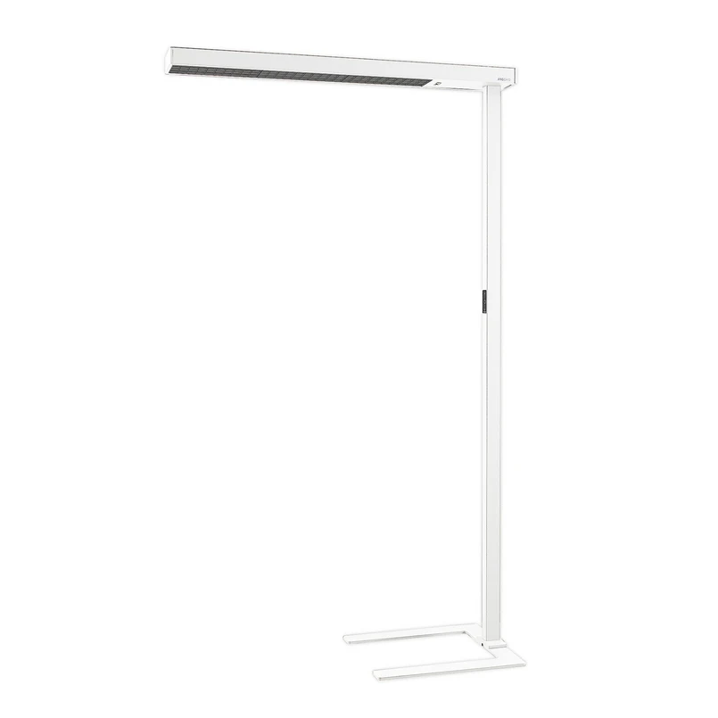 Weiße LED-Office-Stehleuchte Susi mit vielen Funktionen, dimmbar, mit Tageslichtsensor und Bewegungsmelder, flickerfrei und für Bildschirmarbeitsplätze
