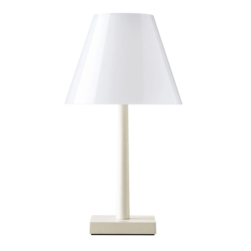 Dina+ Tischleuchte Weiß/Bronze ist eine klassische Leuchte aus Polycarbonat, jedoch mit dem feinen Detail, dass der Lampenschirm durchsichtig wird, sobald das Licht angeschaltet wird. Ist die Lampe ausgeschaltet, hängt ein schöner, klassischer, farbiger Lampenschirm über dem Tisch.