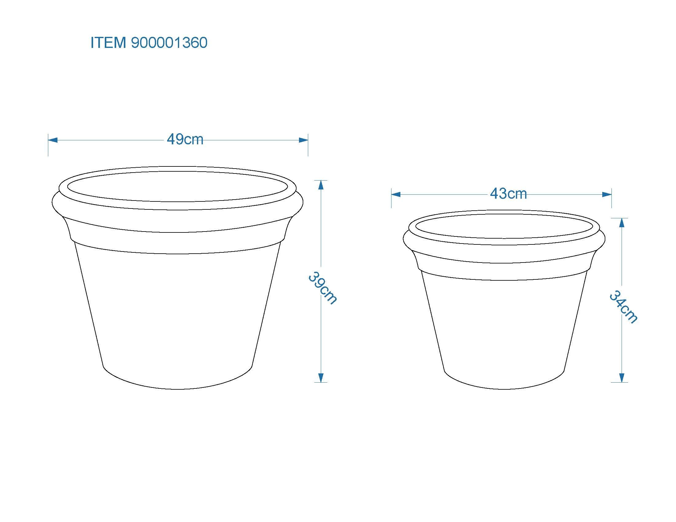 - kleiner Blumentopf: Höhe 34 cm, Ø 43 cm; großer Blumentopf: Höhe 43 cm, Ø 54 cm