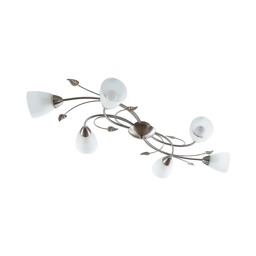 Die moderne Deckenleuchte Yannie ist ideal für die Grundbeleuchtung von modernen Wohnräumen. Mit ihren sechs Fassungen, die mit passenden Leuchtmitteln bestückt werden können, strahlt die Leuchte Yannie mit einem angenehmen Licht gleichmäßig und blendfrei in den Raum hinein. Das metallene Gestell ist hier in satiniertem Nickel gehalten und wird kontrastreich ergänzt von weißen, leicht marmorierten Glasschirmen. Diese sitzen am oberen Ende von elegant geschwungenen Leuchtenarmen, die dekorativ mit keinen Blättern versehen sind.