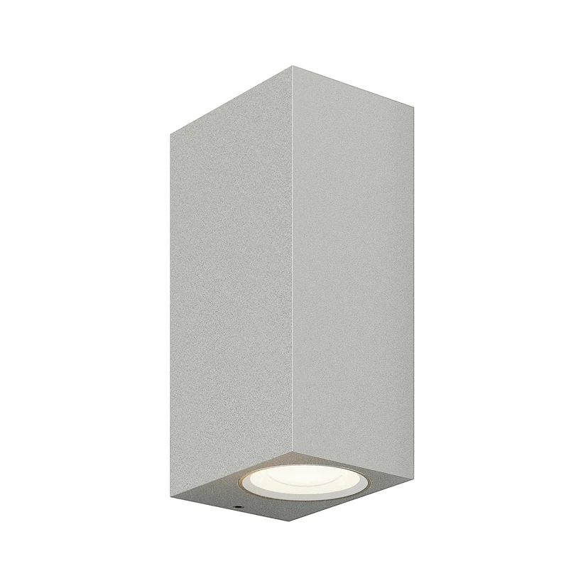 Der rechteckige Körper der Lampe ist aus Aluminium gefertigt und verfügt über die Schutzart IP54, die sie vor Wind, Wetter und Witterung schützt. Sie verfügt über eine eingebaute LED-Lichtquelle, die einen effizienten Lichtschein abgibt und den Stromverbrauch optimiert. Die Lampe hat zwei Lichtauslässe - einen an jedem Ende -, wodurch eine schöne zweiteilige Lampe mit Sanduhrsilhouette entsteht. Jede Lampe hat einen Winkel von etwa 90 Grad, so dass sie aus der Ferne leicht zu erkennen ist. Der schöne Sanduhr-Effekt lässt sich noch verstärken, indem man mehrere Tavi-Lampen aufstellt, zum Beispiel entlang der Fassade eines Hauses oder als Teil eines Eingangs.